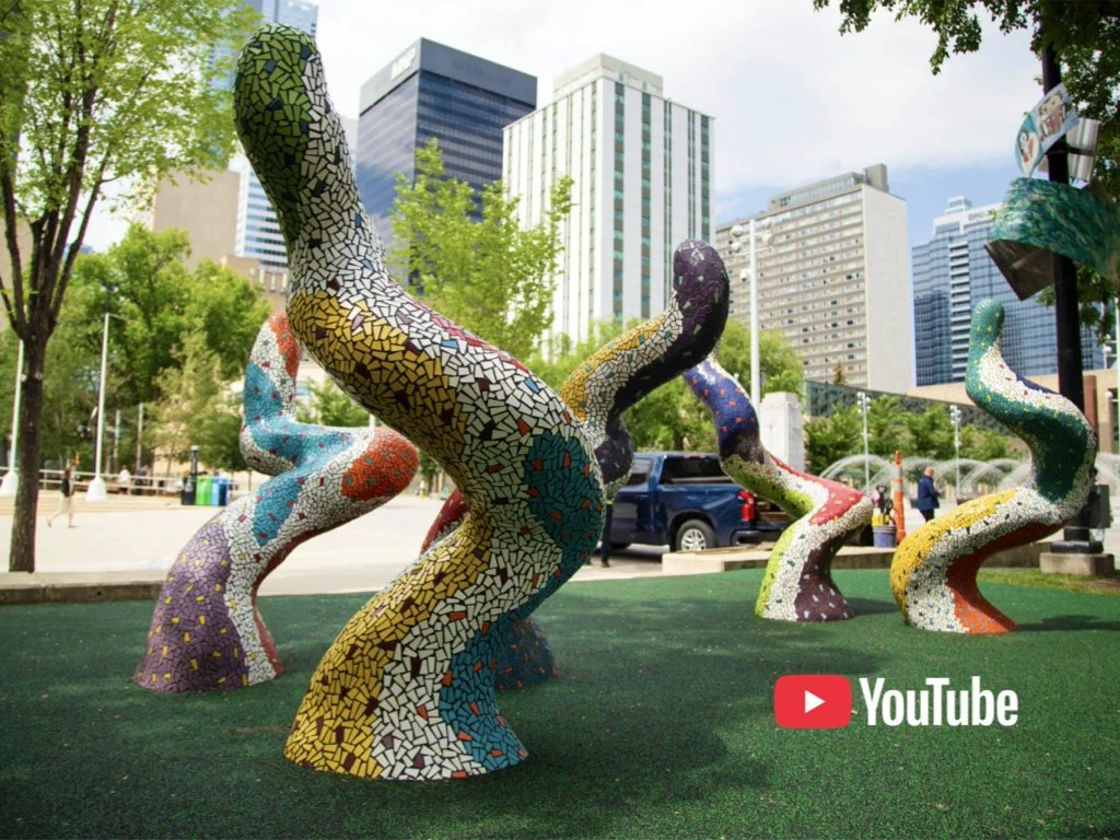 A playful family of five standing mosaic sculptures created for the Edmonton Civic Precinct. Designed as a space for children to imagine, explore, and invent stories, these gestural forms lean between the familiar and the fantastical. They stand like a small forest of bold and joyfully strange objects, inviting visitors of all ages to linger, touch, play, and wonder.
