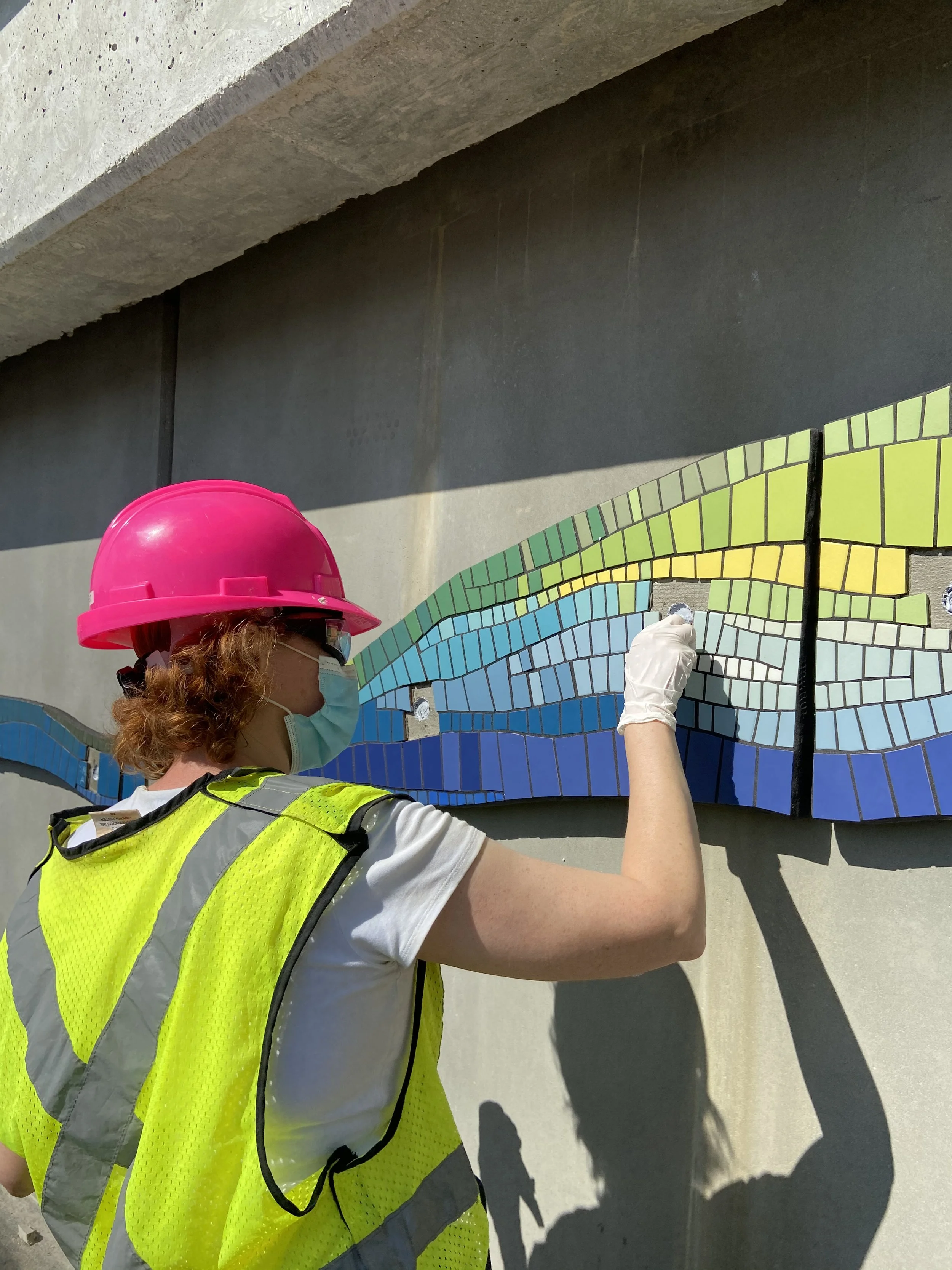 The mosaic murals appear to float alongside the LRT ramp, held at a carefully calibrated height that allows the work to be clearly perceived from different viewpoints. Achieving this sense of effortlessness required extensive coordination between design, engineering, and installation.